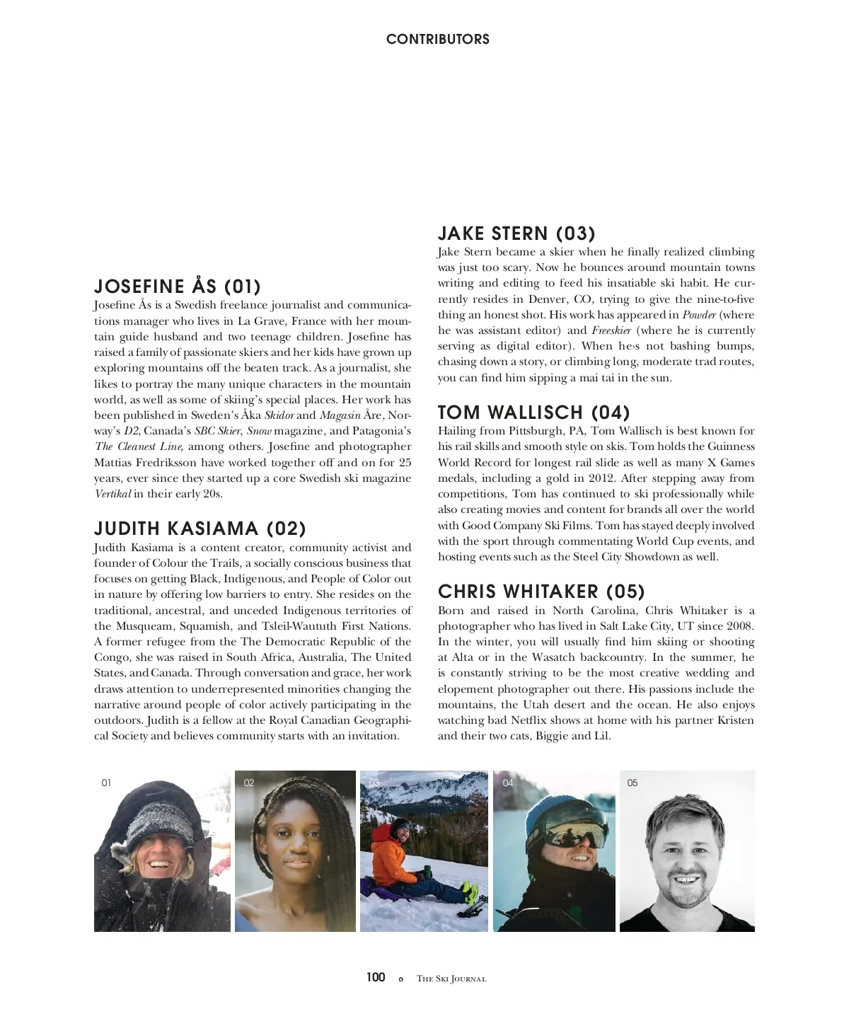 CONTRIBUTORS JAKE STERN (03) JOSEFINE ÅS (01) Josefine Ås is a Swedish freelance journalist and communica-tions manager who lives in La Grave, France with her moun-tain guide husband and two teenage children. Josefine has raised a family of passionate skiers and her kids have grown up exploring mountains off the beaten track. As a journalist, she likes to portray the many unique characters in the mountain world, as well as some of skiing’s special places. Her work has been published in Sweden’s Åka Skidor and Magasin Åre, Nor-way’s D2 , Canada’s SBC Skier , Snow magazine, and Patagonia’s The Cleanest Line , among others. Josefine and photographer Mattias Fredriksson have worked together off and on for 25 years, ever since they started up a core Swedish ski magazine Vertikal in their early 20s. Jake Stern became a skier when he finally realized climbing was just too scary. Now he bounces around mountain towns writing and editing to feed his insatiable ski habit. He cur-rently resides in Denver, CO, trying to give the nine-to-five thing an honest shot. His work has appeared in Powder (where he was assistant editor) and Freeskier (where he is currently serving as digital editor). When he›s not bashing bumps, chasing down a story, or climbing long, moderate trad routes, you can find him sipping a mai tai in the sun. TOM WALLISCH (04) Hailing from Pittsburgh, PA, Tom Wallisch is best known for his rail skills and smooth style on skis. Tom holds the Guinness World Record for longest rail slide as well as many X Games medals, including a gold in 2012. After stepping away from competitions, Tom has continued to ski professionally while also creating movies and content for brands all over the world with Good Company Ski Films. Tom has stayed deeply involved with the sport through commentating World Cup events, and hosting events such as the Steel City Showdown as well. JUDITH KASIAMA (02) Judith Kasiama is a content creator, community activist and founder of Colour the Trails, a socially conscious business that focuses on getting Black, Indigenous, and People of Color out in nature by offering low barriers to entry. She resides on the traditional, ancestral, and unceded Indigenous territories of the Musqueam, Squamish, and Tsleil-Waututh First Nations. A former refugee from the The Democratic Republic of the Congo, she was raised in South Africa, Australia, The United States, and Canada. Through conversation and grace, her work draws attention to underrepresented minorities changing the narrative around people of color actively participating in the outdoors. Judith is a fellow at the Royal Canadian Geographi-cal Society and believes community starts with an invitation. CHRIS WHITAKER (05) Born and raised in North Carolina, Chris Whitaker is a photographer who has lived in Salt Lake City, UT since 2008. In the winter, you will usually find him skiing or shooting at Alta or in the Wasatch backcountry. In the summer, he is constantly striving to be the most creative wedding and elopement photographer out there. His passions include the mountains, the Utah desert and the ocean. He also enjoys watching bad Netflix shows at home with his partner Kristen and their two cats, Biggie and Lil. 01 02 03 04 05 100 The Ski Journal