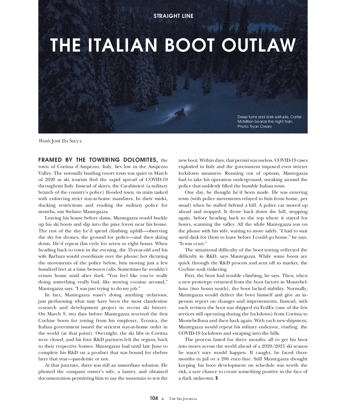 STRAIGHT LINE THE ITALIAN BOOT OUTLAW Deep turns and dark solitude, Carter McMillan boards the night train. Photo: Ryan Creary Words José Da Silva FRAMED BY THE TOWERING DOLOMITES, the town of Cortina d’Ampezzo, Italy, lies low in the Ampezzo Valley. The normally bustling resort town was quiet in March of 2020 as ski tourists fled the rapid spread of COVID-19 throughout Italy. Instead of skiers, the Carabinieri (a military branch of the country’s police) flooded town, its units tasked with enforcing strict stay-at-home mandates. In their midst, ducking restrictions and evading the military police for months, was Stefano Mantegazza. Leaving his house before dawn, Mantegazza would buckle up his ski boots and slip into the pine forest near his house. The rest of the day he’d spend climbing uphill—observing the sky for drones, the ground for police—and then skiing down. He’d repeat this cycle for seven or eight hours. When heading back to town in the evening, the 55-year-old and his wife Barbara would coordinate over the phone; her dictating the movements of the police below, him moving just a few hundred feet at a time between calls. Sometimes he wouldn’t return home until after dark. “You feel like you’re really doing something really bad, like moving cocaine around,” Mantegazza says. “I was just trying to do my job.” In fact, Mantegazza wasn’t doing anything nefarious, just performing what may have been the most clandestine research and development project in recent ski history. On March 9, two days before Mantegazza received the first Cochise boots for testing from his employer, Tecnica, the Italian government issued the strictest stay-at-home order in the world (at that point). Overnight, the ski lifts in Cortina were closed, and his four R&D partners left the region, back to their respective homes. Mantegazza had until late June to complete his R&D on a product that was bound for shelves later that year—pandemic or not. At that juncture, there was still an immediate solution. He phoned the company owner’s wife, a lawyer, and obtained documentation permitting him to use the mountain to test the new boot. Within days, that permit was useless. COVID-19 cases exploded in Italy and the government imposed even stricter lockdown measures. Running out of options, Mantegazza had to take his operation underground, sneaking around the police that suddenly filled the humble Italian town. One day, he thought he’d been made. He was entering town (with police movements relayed to him from home, per usual) when he stalled behind a hill. A police car moved up ahead and stopped. It drove back down the hill, stopping again, before heading back to the top where it stayed for hours, scanning the valley. All the while Mantegazza was on the phone with his wife, waiting to move safely. “I had to wait until dark for them to leave before I could go home,” he says. “It was crazy.” The situational difficulty of the boot testing reflected the difficulty in R&D, says Mantegazza. While some boots are quick through the R&D process and sent off to market, the Cochise took tinkering. First, the boot had trouble climbing, he says. Then, when a new prototype returned from the boot factory in Montebel-luna (two hours south), the boot lacked stability. Normally, Mantegazza would deliver the boot himself and give an in-person report on changes and improvements. Instead, with each revision the boot was shipped via FedEx (one of the few services still operating during the lockdown) from Cortina to Montebelluna and then back again. With each new shipment, Mantegazza would repeat his solitary endeavor, evading the COVID-19 lockdown and escaping into the hills. The process lasted for three months, all to get his boot into stores across the world ahead of a 2020/2021 ski season he wasn’t sure would happen. If caught, he faced three months in jail or a 206 euro fine. Still Mantegazza thought keeping his boot development on schedule was worth the risk, a rare chance to create something positive in the face of a dark unknown. 104 The Ski Journal