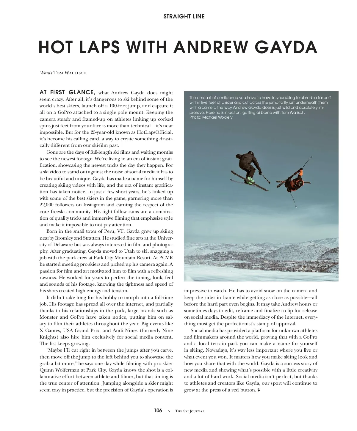 STRAIGHT LINE HOT LAPS WITH ANDREW GAYDA Words Tom Wallisch AT FIRST GLANCE, what Andrew Gayda does might seem crazy. After all, it’s dangerous to ski behind some of the world’s best skiers, launch off a 100-foot jump, and capture it all on a GoPro attached to a single pole mount. Keeping the camera steady and framed-up on athletes linking up corked spins just feet from your face is more than technical—it’s near impossible. But for the 25-year-old known as HotLapsOfficial, it’s become his calling card, a way to create something drasti-cally different from our ski-film past. Gone are the days of full-length ski films and waiting months to see the newest footage. We’re living in an era of instant grati-fication, showcasing the newest tricks the day they happen. For a ski video to stand out against the noise of social media it has to be beautiful and unique. Gayda has made a name for himself by creating skiing videos with life, and the era of instant gratifica-tion has taken notice. In just a few short years, he’s linked up with some of the best skiers in the game, garnering more than 22,000 followers on Instagram and earning the respect of the core freeski community. His tight follow cams are a combina-tion of quality tricks and immersive filming that emphasize style and make it impossible to not pay attention. Born in the small town of Peru, VT, Gayda grew up skiing nearby Bromley and Stratton. He studied fine arts at the Univer-sity of Delaware but was always interested in film and photogra-phy. After graduating, Gayda moved to Utah to ski, snagging a job with the park crew at Park City Mountain Resort. At PCMR he started meeting pro skiers and picked up his camera again. A passion for film and art motivated him to film with a refreshing rawness. He worked for years to perfect the timing, look, feel and sounds of his footage, knowing the tightness and speed of his shots created high energy and tension. It didn’t take long for his hobby to morph into a full-time job. His footage has spread all over the internet, and partially thanks to his relationships in the park, large brands such as Monster and GoPro have taken notice, putting him on sal-ary to film their athletes throughout the year. Big events like X Games, USA Grand Prix, and Audi Nines (formerly Nine Knights) also hire him exclusively for social media content. The list keeps growing. “Maybe I’ll cut right in between the jumps after you carve, then move off the jump to the left behind you to showcase the grab a bit more,” he says one day while filming with pro skier Quinn Wolferman at Park City. Gayda knows the shot is a col-laborative effort between athlete and filmer, but that timing is the true center of attention. Jumping alongside a skier might seem easy in practice, but the precision of Gayda’s operation is The amount of confidence you have to have in your skiing to absorb a takeoff within five feet of a rider and cut across the jump to fly just underneath them with a camera the way Andrew Gayda does is just wild and absolutely im-pressive. Here he is in action, getting airborne with Tom Wallisch. Photo: Michael Woolery impressive to watch. He has to avoid snow on the camera and keep the rider in frame while getting as close as possible—all before the hard part even begins. It may take Andrew hours or sometimes days to edit, reframe and finalize a clip for release on social media. Despite the immediacy of the internet, every-thing must get the perfectionist’s stamp of approval. Social media has provided a platform for unknown athletes and filmmakers around the world, proving that with a GoPro and a local terrain park you can make a name for yourself in skiing. Nowadays, it’s way less important where you live or what event you won. It matters how you make skiing look and how you share that with the world. Gayda is a success story of new media and showing what’s possible with a little creativity and a lot of hard work. Social media isn’t perfect, but thanks to athletes and creators like Gayda, our sport will continue to grow at the press of a red button. 106 The Ski Journal