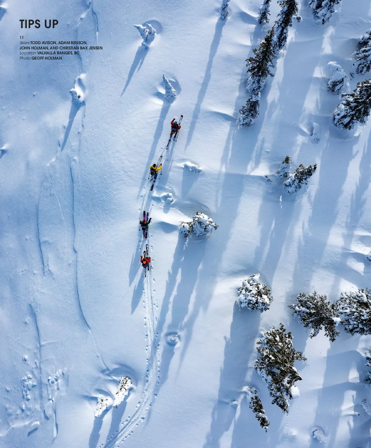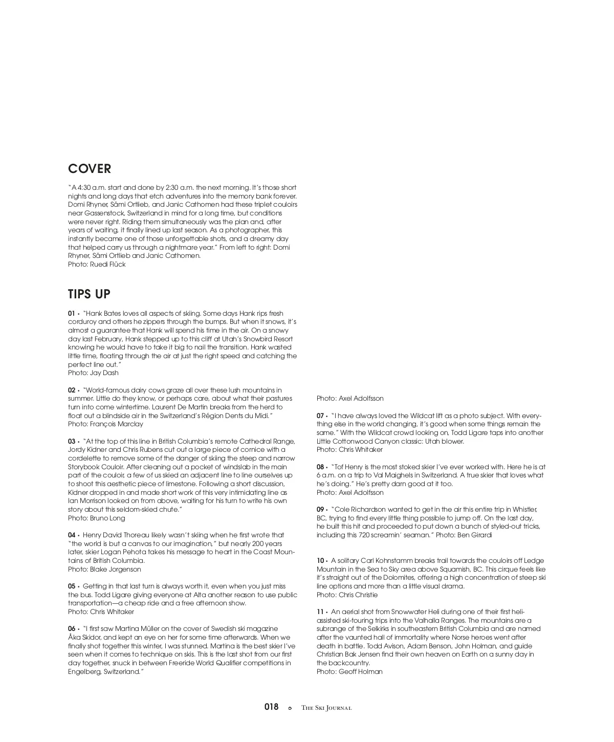 COVER “A 4:30 a.m. start and done by 2:30 a.m. the next morning. It’s those short nights and long days that etch adventures into the memory bank forever. Domi Rhyner, Sämi Ortlieb, and Janic Cathomen had these triplet couloirs near Gassenstock, Switzerland in mind for a long time, but conditions were never right. Riding them simultaneously was the plan and, after years of waiting, it finally lined up last season. As a photographer, this instantly became one of those unforgettable shots, and a dreamy day that helped carry us through a nightmare year.” From left to right: Domi Rhyner, Sämi Ortlieb and Janic Cathomen. Photo: Ruedi Flück TIPS UP 01 • “Hank Bates loves all aspects of skiing. Some days Hank rips fresh corduroy and others he zippers through the bumps. But when it snows, it’s almost a guarantee that Hank will spend his time in the air. On a snowy day last February, Hank stepped up to this cliff at Utah’s Snowbird Resort knowing he would have to take it big to nail the transition. Hank wasted little time, floating through the air at just the right speed and catching the perfect line out.” Photo: Jay Dash 02 • “World-famous dairy cows graze all over these lush mountains in summer. Little do they know, or perhaps care, about what their pastures turn into come wintertime. Laurent De Martin breaks from the herd to float out a blindside air in the Switzerland’s Région Dents du Midi.” Photo: François Marclay 03 • “At the top of this line in British Columbia’s remote Cathedral Range, Jordy Kidner and Chris Rubens cut out a large piece of cornice with a cordelette to remove some of the danger of skiing the steep and narrow Storybook Couloir. After cleaning out a pocket of windslab in the main part of the couloir, a few of us skied an adjacent line to line ourselves up to shoot this aesthetic piece of limestone. Following a short discussion, Kidner dropped in and made short work of this very intimidating line as Ian Morrison looked on from above, waiting for his turn to write his own story about this seldom-skied chute.” Photo: Bruno Long 04 • Henry David Thoreau likely wasn’t skiing when he first wrote that “the world is but a canvas to our imagination,” but nearly 200 years later, skier Logan Pehota takes his message to heart in the Coast Moun-tains of British Columbia. Photo: Blake Jorgenson 05 • Getting in that last turn is always worth it, even when you just miss the bus. Todd Ligare giving everyone at Alta another reason to use public transportation —a cheap ride and a free afternoon show. Photo: Chris Whitaker 06 • “I first saw Martina Müller on the cover of Swedish ski magazine Åka Skidor, and kept an eye on her for some time afterwards. When we finally shot together this winter, I was stunned. Martina is the best skier I’ve seen when it comes to technique on skis. This is the last shot from our first day together, snuck in between Freeride World Qualifier competitions in Engelberg, Switzerland.” Photo: Axel Adolfsson 07 • “I have always loved the Wildcat lift as a photo subject. With every-thing else in the world changing, it’s good when some things remain the same.” With the Wildcat crowd looking on, Todd Ligare taps into another Little Cottonwood Canyon classic: Utah blower. Photo: Chris Whitaker 08 • “Tof Henry is the most stoked skier I’ve ever worked with. Here he is at 6 a.m. on a trip to Val Maighels in Switzerland. A true skier that loves what he’s doing.” He’s pretty darn good at it too. Photo: Axel Adolfsson 09 • “Cole Richardson wanted to get in the air this entire trip in Whistler, BC, trying to find every little thing possible to jump off. On the last day, he built this hit and proceeded to put down a bunch of styled-out tricks, including this 720 screamin’ seaman.” Photo: Ben Girardi 10 • A solitary Carl Kohnstamm breaks trail towards the couloirs off Ledge Mountain in the Sea to Sky area above Squamish, BC. This cirque feels like it’s straight out of the Dolomites, offering a high concentration of steep ski line options and more than a little visual drama. Photo: Chris Christie 11 • An aerial shot from Snowwater Heli during one of their first heli-assisted ski-touring trips into the Valhalla Ranges. The mountains are a subrange of the Selkirks in southeastern British Columbia and are named after the vaunted hall of immortality where Norse heroes went after death in battle. Todd Avison, Adam Benson, John Holman, and guide Christian Bak Jensen find their own heaven on Earth on a sunny day in the backcountry. Photo: Geoff Holman 018 The Ski Journal
