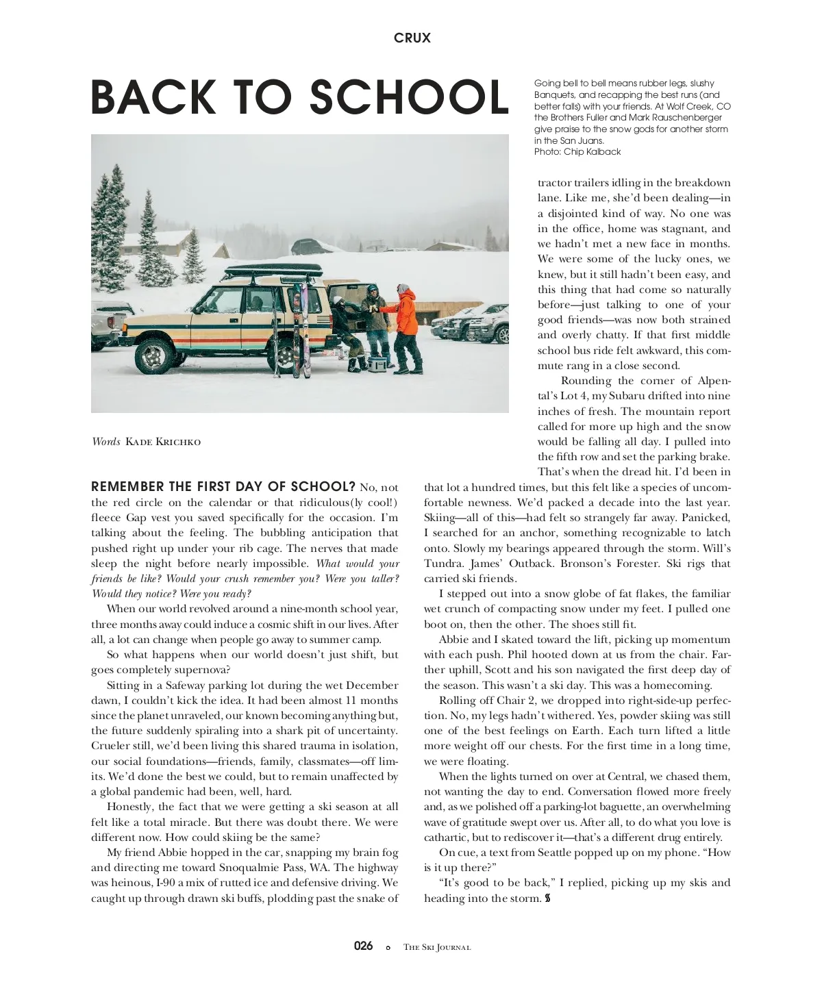 CRUX BACK TO SCHOOL Going bell to bell means rubber legs, slushy Banquets, and recapping the best runs (and better falls) with your friends. At Wolf Creek, CO the Brothers Fuller and Mark Rauschenberger give praise to the snow gods for another storm in the San Juans. Photo: Chip Kalback Words Kade Krichko REMEMBER THE FIRST DAY OF SCHOOL? No, not the red circle on the calendar or that ridiculous(ly cool!) fleece Gap vest you saved specifically for the occasion. I’m talking about the feeling. The bubbling anticipation that pushed right up under your rib cage. The nerves that made sleep the night before nearly impossible. What would your friends be like? Would your crush remember you? Were you taller? Would they notice? Were you ready? When our world revolved around a nine-month school year, three months away could induce a cosmic shift in our lives. After all, a lot can change when people go away to summer camp. So what happens when our world doesn’t just shift, but goes completely supernova? Sitting in a Safeway parking lot during the wet December dawn, I couldn’t kick the idea. It had been almost 11 months since the planet unraveled, our known becoming anything but, the future suddenly spiraling into a shark pit of uncertainty. Crueler still, we’d been living this shared trauma in isolation, our social foundations—friends, family, classmates—off lim-its. We’d done the best we could, but to remain unaffected by a global pandemic had been, well, hard. Honestly, the fact that we were getting a ski season at all felt like a total miracle. But there was doubt there. We were different now. How could skiing be the same? My friend Abbie hopped in the car, snapping my brain fog and directing me toward Snoqualmie Pass, WA. The highway was heinous, I-90 a mix of rutted ice and defensive driving. We caught up through drawn ski buffs, plodding past the snake of tractor trailers idling in the breakdown lane. Like me, she’d been dealing—in a disjointed kind of way. No one was in the office, home was stagnant, and we hadn’t met a new face in months. We were some of the lucky ones, we knew, but it still hadn’t been easy, and this thing that had come so naturally before—just talking to one of your good friends—was now both strained and overly chatty. If that first middle school bus ride felt awkward, this com-mute rang in a close second. Rounding the corner of Alpen-tal’s Lot 4, my Subaru drifted into nine inches of fresh. The mountain report called for more up high and the snow would be falling all day. I pulled into the fifth row and set the parking brake. That’s when the dread hit. I’d been in that lot a hundred times, but this felt like a species of uncom-fortable newness. We’d packed a decade into the last year. Skiing—all of this—had felt so strangely far away. Panicked, I searched for an anchor, something recognizable to latch onto. Slowly my bearings appeared through the storm. Will’s Tundra. James’ Outback. Bronson’s Forester. Ski rigs that carried ski friends. I stepped out into a snow globe of fat flakes, the familiar wet crunch of compacting snow under my feet. I pulled one boot on, then the other. The shoes still fit. Abbie and I skated toward the lift, picking up momentum with each push. Phil hooted down at us from the chair. Far-ther uphill, Scott and his son navigated the first deep day of the season. This wasn’t a ski day. This was a homecoming. Rolling off Chair 2, we dropped into right-side-up perfec-tion. No, my legs hadn’t withered. Yes, powder skiing was still one of the best feelings on Earth. Each turn lifted a little more weight off our chests. For the first time in a long time, we were floating. When the lights turned on over at Central, we chased them, not wanting the day to end. Conversation flowed more freely and, as we polished off a parking-lot baguette, an overwhelming wave of gratitude swept over us. After all, to do what you love is cathartic, but to rediscover it—that’s a different drug entirely. On cue, a text from Seattle popped up on my phone. “How is it up there?” “It’s good to be back,” I replied, picking up my skis and heading into the storm. 026 The Ski Journal