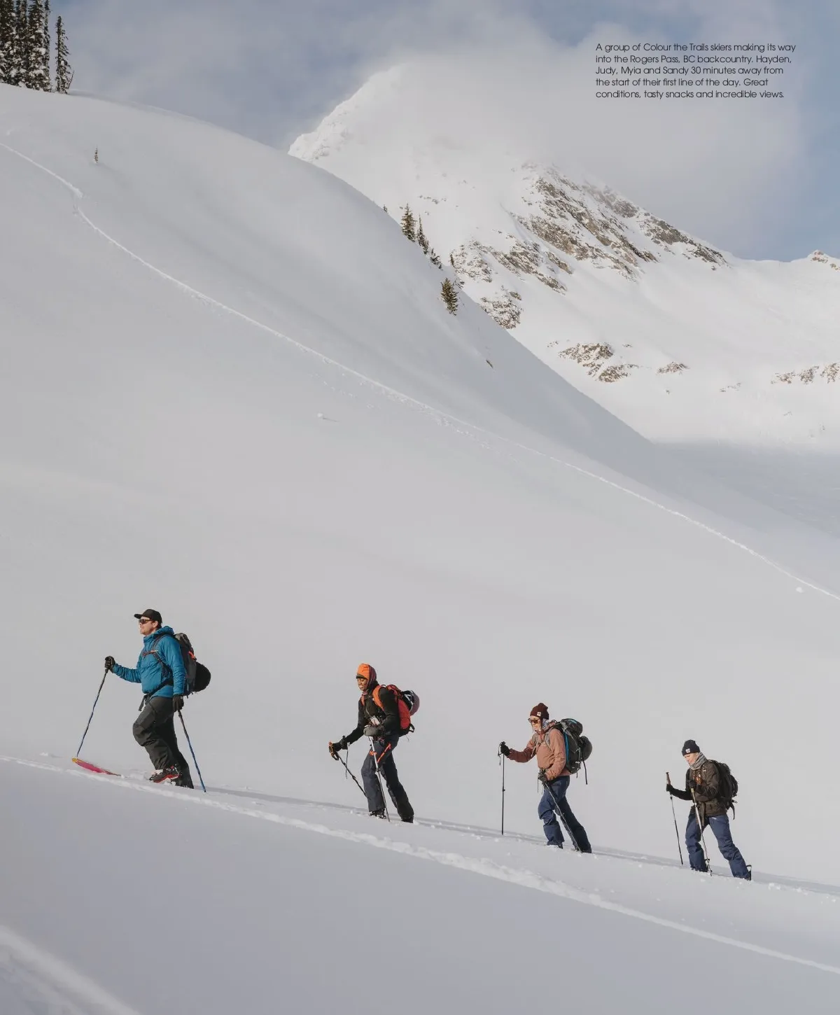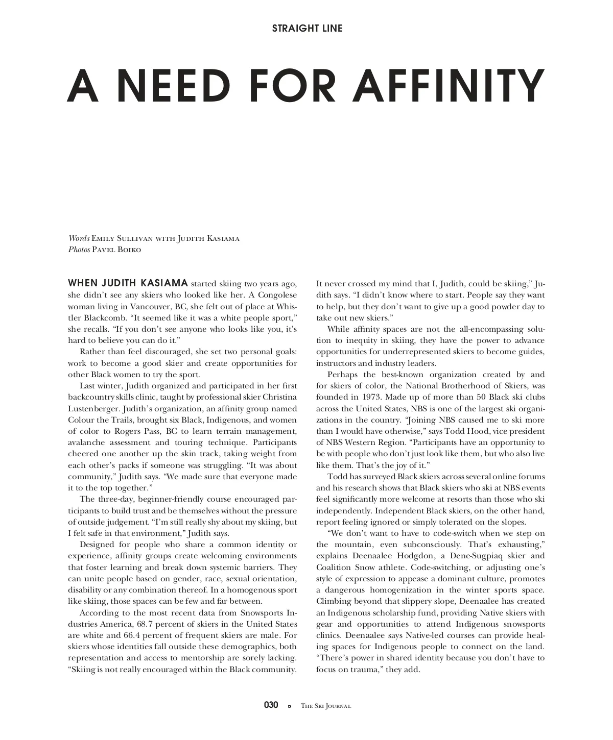 STRAIGHT LINE A NEED FOR AFFINITY Words Emily Sullivan with Judith Kasiama Photos Pavel Boiko WHEN JUDITH KASIAMA started skiing two years ago, she didn’t see any skiers who looked like her. A Congolese woman living in Vancouver, BC, she felt out of place at Whis-tler Blackcomb. “It seemed like it was a white people sport,” she recalls. “If you don’t see anyone who looks like you, it’s hard to believe you can do it.” Rather than feel discouraged, she set two personal goals: work to become a good skier and create opportunities for other Black women to try the sport. Last winter, Judith organized and participated in her first backcountry skills clinic, taught by professional skier Christina Lustenberger. Judith’s organization, an affinity group named Colour the Trails, brought six Black, Indigenous, and women of color to Rogers Pass, BC to learn terrain management, avalanche assessment and touring technique. Participants cheered one another up the skin track, taking weight from each other’s packs if someone was struggling. “It was about community,” Judith says. “We made sure that everyone made it to the top together.” The three-day, beginner-friendly course encouraged par-ticipants to build trust and be themselves without the pressure of outside judgement. “I’m still really shy about my skiing, but I felt safe in that environment,” Judith says. Designed for people who share a common identity or experience, affinity groups create welcoming environments that foster learning and break down systemic barriers. They can unite people based on gender, race, sexual orientation, disability or any combination thereof. In a homogenous sport like skiing, those spaces can be few and far between. According to the most recent data from Snowsports In-dustries America, 68.7 percent of skiers in the United States are white and 66.4 percent of frequent skiers are male. For skiers whose identities fall outside these demographics, both representation and access to mentorship are sorely lacking. “Skiing is not really encouraged within the Black community. It never crossed my mind that I, Judith, could be skiing,” Ju-dith says. “I didn’t know where to start. People say they want to help, but they don’t want to give up a good powder day to take out new skiers.” While affinity spaces are not the all-encompassing solu-tion to inequity in skiing, they have the power to advance opportunities for underrepresented skiers to become guides, instructors and industry leaders. Perhaps the best-known organization created by and for skiers of color, the National Brotherhood of Skiers, was founded in 1973. Made up of more than 50 Black ski clubs across the United States, NBS is one of the largest ski organi-zations in the country. “Joining NBS caused me to ski more than I would have otherwise,” says Todd Hood, vice president of NBS Western Region. “Participants have an opportunity to be with people who don’t just look like them, but who also live like them. That’s the joy of it.” Todd has surveyed Black skiers across several online forums and his research shows that Black skiers who ski at NBS events feel significantly more welcome at resorts than those who ski independently. Independent Black skiers, on the other hand, report feeling ignored or simply tolerated on the slopes. “We don’t want to have to code-switch when we step on the mountain, even subconsciously. That’s exhausting,” explains Deenaalee Hodgdon, a Dene-Sugpiaq skier and Coalition Snow athlete. Code-switching, or adjusting one’s style of expression to appease a dominant culture, promotes a dangerous homogenization in the winter sports space. Climbing beyond that slippery slope, Deenaalee has created an Indigenous scholarship fund, providing Native skiers with gear and opportunities to attend Indigenous snowsports clinics. Deenaalee says Native-led courses can provide heal-ing spaces for Indigenous people to connect on the land. “There’s power in shared identity because you don’t have to focus on trauma,” they add. 030 The Ski Journal