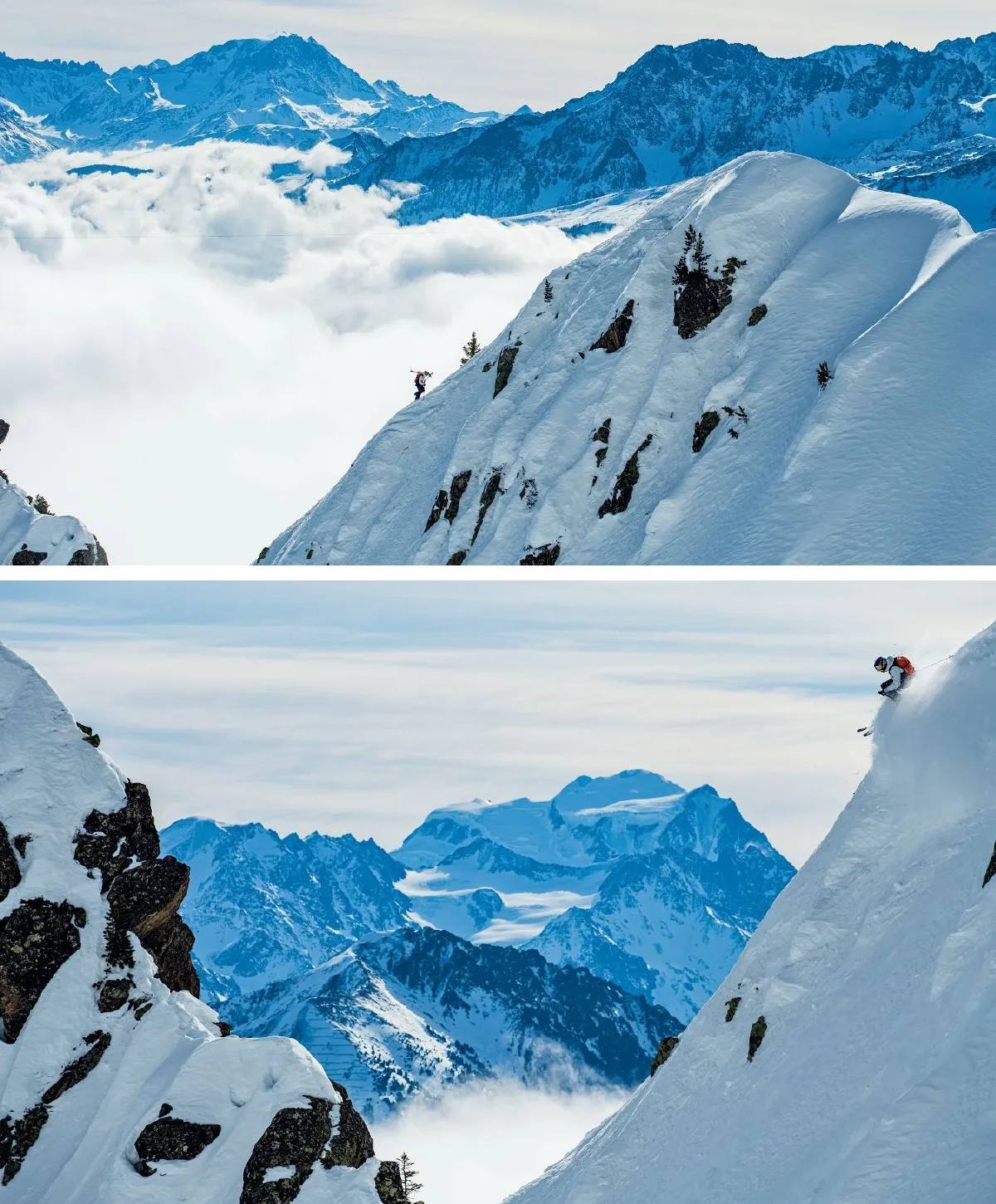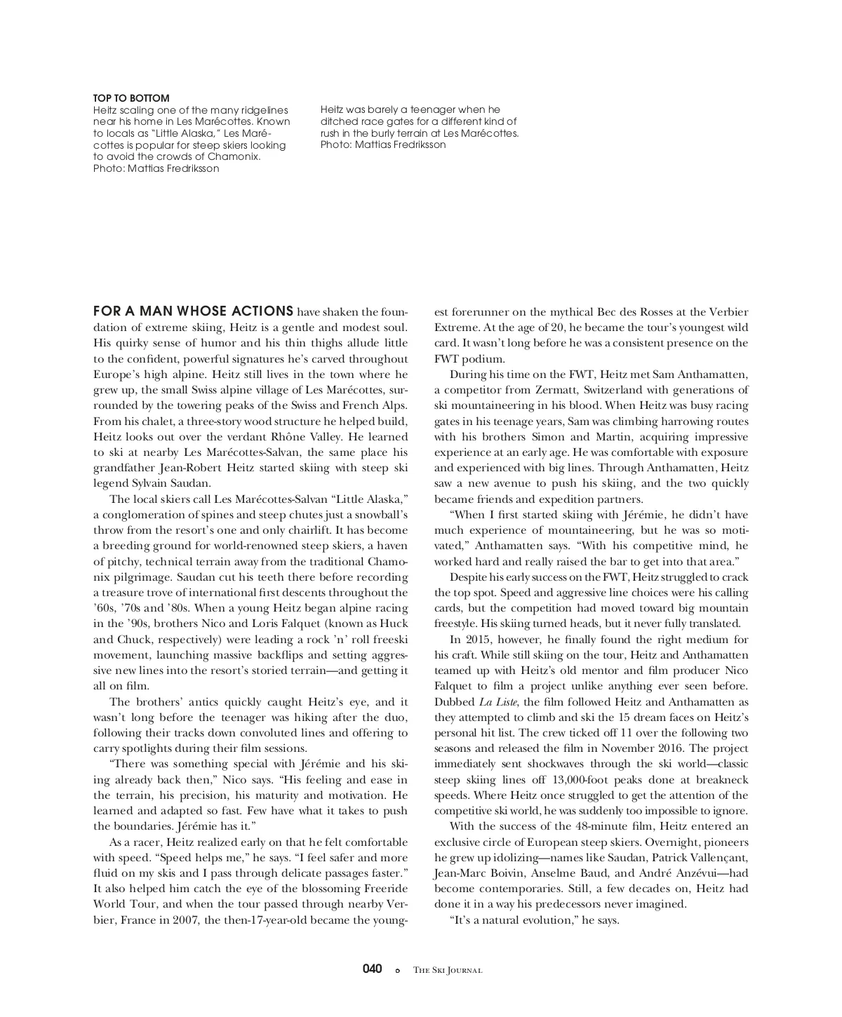 TOP TO BOTTOM Heitz scaling one of the many ridgelines near his home in Les Marécottes. Known to locals as “Little Alaska,” Les Maré-cottes is popular for steep skiers looking to avoid the crowds of Chamonix. Photo: Mattias Fredriksson Heitz was barely a teenager when he ditched race gates for a different kind of rush in the burly terrain at Les Marécottes. Photo: Mattias Fredriksson FOR A MAN WHOSE ACTIONS have shaken the foun-dation of extreme skiing, Heitz is a gentle and modest soul. His quirky sense of humor and his thin thighs allude little to the confident, powerful signatures he’s carved throughout Europe’s high alpine. Heitz still lives in the town where he grew up, the small Swiss alpine village of Les Marécottes, sur-rounded by the towering peaks of the Swiss and French Alps. From his chalet, a three-story wood structure he helped build, Heitz looks out over the verdant Rhône Valley. He learned to ski at nearby Les Marécottes-Salvan, the same place his grandfather Jean-Robert Heitz started skiing with steep ski legend Sylvain Saudan. The local skiers call Les Marécottes-Salvan “Little Alaska,” a conglomeration of spines and steep chutes just a snowball’s throw from the resort’s one and only chairlift. It has become a breeding ground for world-renowned steep skiers, a haven of pitchy, technical terrain away from the traditional Chamo-nix pilgrimage. Saudan cut his teeth there before recording a treasure trove of international first descents throughout the ’60s, ’70s and ’80s. When a young Heitz began alpine racing in the ’90s, brothers Nico and Loris Falquet (known as Huck and Chuck, respectively) were leading a rock ’n’ roll freeski movement, launching massive backflips and setting aggres-sive new lines into the resort’s storied terrain—and getting it all on film. The brothers’ antics quickly caught Heitz’s eye, and it wasn’t long before the teenager was hiking after the duo, following their tracks down convoluted lines and offering to carry spotlights during their film sessions. “There was something special with Jérémie and his ski-ing already back then,” Nico says. “His feeling and ease in the terrain, his precision, his maturity and motivation. He learned and adapted so fast. Few have what it takes to push the boundaries. Jérémie has it.” As a racer, Heitz realized early on that he felt comfortable with speed. “Speed helps me,” he says. “I feel safer and more fluid on my skis and I pass through delicate passages faster.” It also helped him catch the eye of the blossoming Freeride World Tour, and when the tour passed through nearby Ver-bier, France in 2007, the then-17-year-old became the young-est forerunner on the mythical Bec des Rosses at the Verbier Extreme. At the age of 20, he became the tour’s youngest wild card. It wasn’t long before he was a consistent presence on the FWT podium. During his time on the FWT, Heitz met Sam Anthamatten, a competitor from Zermatt, Switzerland with generations of ski mountaineering in his blood. When Heitz was busy racing gates in his teenage years, Sam was climbing harrowing routes with his brothers Simon and Martin, acquiring impressive experience at an early age. He was comfortable with exposure and experienced with big lines. Through Anthamatten, Heitz saw a new avenue to push his skiing, and the two quickly became friends and expedition partners. “When I first started skiing with Jérémie, he didn’t have much experience of mountaineering, but he was so moti-vated,” Anthamatten says. “With his competitive mind, he worked hard and really raised the bar to get into that area.” Despite his early success on the FWT, Heitz struggled to crack the top spot. Speed and aggressive line choices were his calling cards, but the competition had moved toward big mountain freestyle. His skiing turned heads, but it never fully translated. In 2015, however, he finally found the right medium for his craft. While still skiing on the tour, Heitz and Anthamatten teamed up with Heitz’s old mentor and film producer Nico Falquet to film a project unlike anything ever seen before. Dubbed La Liste , the film followed Heitz and Anthamatten as they attempted to climb and ski the 15 dream faces on Heitz’s personal hit list. The crew ticked off 11 over the following two seasons and released the film in November 2016. The project immediately sent shockwaves through the ski world—classic steep skiing lines off 13,000-foot peaks done at breakneck speeds. Where Heitz once struggled to get the attention of the competitive ski world, he was suddenly too impossible to ignore. With the success of the 48-minute film, Heitz entered an exclusive circle of European steep skiers. Overnight, pioneers he grew up idolizing—names like Saudan, Patrick Vallençant, Jean-Marc Boivin, Anselme Baud, and André Anzévui—had become contemporaries. Still, a few decades on, Heitz had done it in a way his predecessors never imagined. “It’s a natural evolution,” he says. 040 The Ski Journal