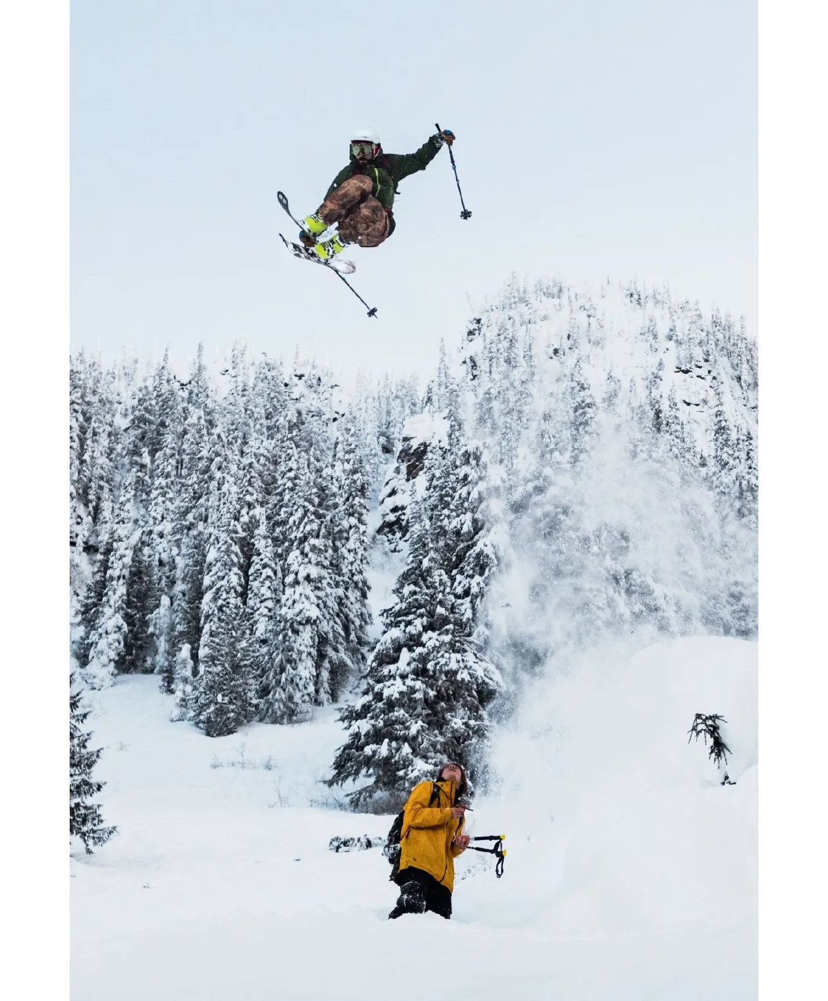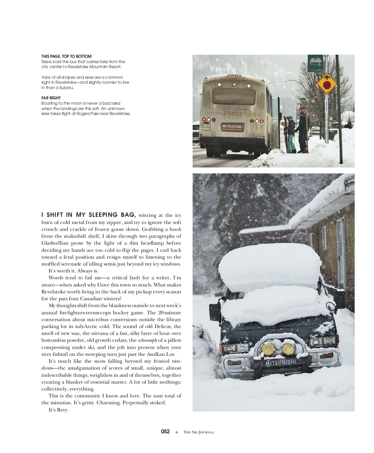 THIS PAGE, TOP TO BOTTOM Skiers load the bus that carries folks from the city center to Revelstoke Mountain Resort. Vans of all shapes and sizes are a common sight in Revelstoke—and slightly roomier to live in than a Subaru. FAR RIGHT Boosting to the moon is never a bad idea when the landings are this soft. An unknown skier takes flight at Rogers Pass near Revelstoke. I SHIFT IN MY SLEEPING BAG, wincing at the icy burn of cold metal from my zipper, and try to ignore the soft crunch and crackle of frozen goose down. Grabbing a book from the makeshift shelf, I skim through two paragraphs of Gladwellian prose by the light of a dim headlamp before deciding my hands are too cold to flip the pages. I curl back toward a fetal position and resign myself to listening to the muffled serenade of idling semis just beyond my icy windows. It’s worth it. Always is. Words tend to fail me—a critical fault for a writer, I’m aware—when asked why I love this town so much. What makes Revelstoke worth living in the back of my pickup every season for the past four Canadian winters? My thoughts shift from the blankness outside to next week’s annual firefighters-versus-cops hockey game. The 20-minute conversation about microbus conversions outside the library parking lot in sub-Arctic cold. The sound of old Delicas, the smell of new wax, the nirvana of a fast, silky layer of hoar over bottomless powder, old growth cedars, the whoomph of a pillow compressing under ski, and the jolt into present when your tires fishtail on the sweeping turn just past the Asulkan Lot. It’s much like the snow falling beyond my frosted win-dows—the amalgamation of scores of small, unique, almost indescribable things, weightless in and of themselves, together creating a blanket of essential matter. A lot of little nothings; collectively, everything. This is the community I know and love. The sum total of the minutiae. It’s gritty. Charming. Perpetually stoked. It’s Revy. 052 The Ski Journal