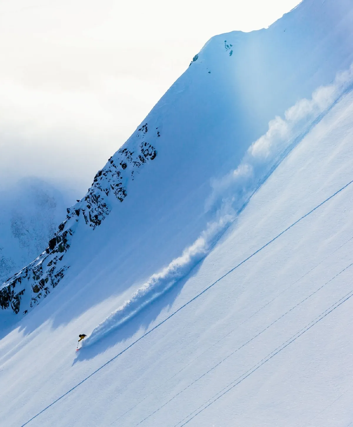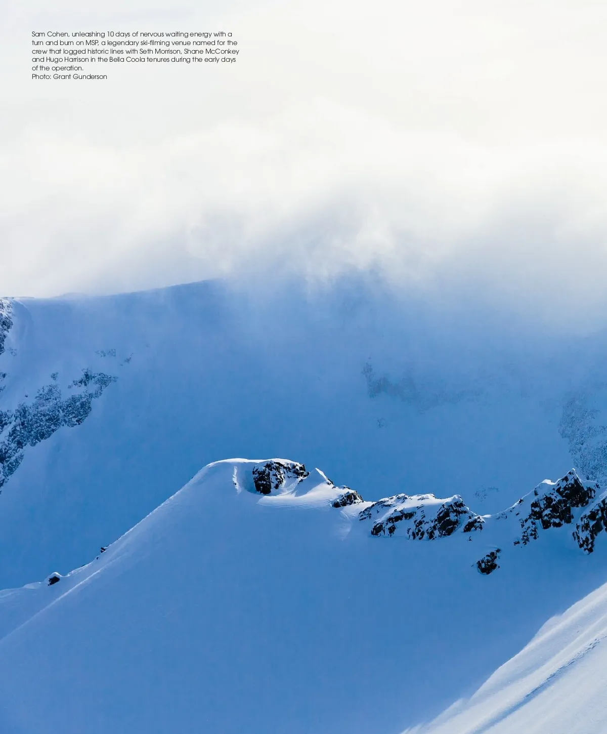 Sam Cohen, unleashing 10 days of nervous waiting energy with a turn and burn on MSP, a legendary ski-filming venue named for the crew that logged historic lines with Seth Morrison, Shane McConkey and Hugo Harrison in the Bella Coola tenures during the early days of the operation. Photo: Grant Gunderson
