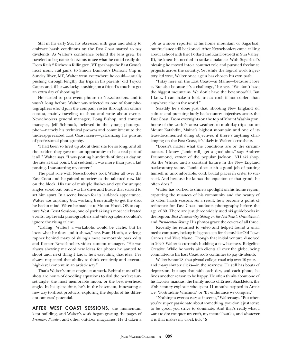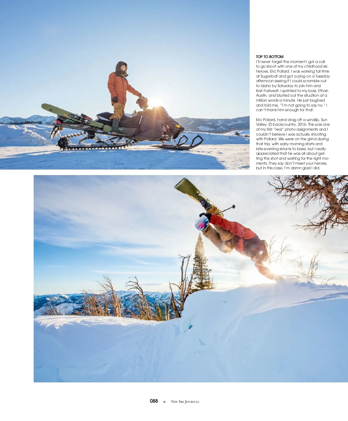 TOP TO BOTTOM I’ll never forget the moment I got a call to go shoot with one of my childhood ski heroes, Eric Pollard. I was working full time at Sugarloaf and got a ping on a Tuesday afternoon seeing if I could scramble out to Idaho by Saturday to join him and Karl Fostvedt. I sprinted to my boss, Ethan Austin, and blurted out the situation at a million words a minute. He just laughed and told me, “I’m not going to say no.” I can’t thank him enough for that. Eric Pollard, hand drag off a windlip, Sun Valley, ID backcountry, 2016. This was one of my first “real” photo assignments and I couldn’t believe I was actually shooting with Pollard. We were on the grind during that trip, with early morning starts and late-evening returns to base, but I really appreciated that he was all about get-ting the shot and waiting for the right mo-ments. They say don’t meet your heroes, but in this case, I’m damn glad I did. 088 The Ski Journal
