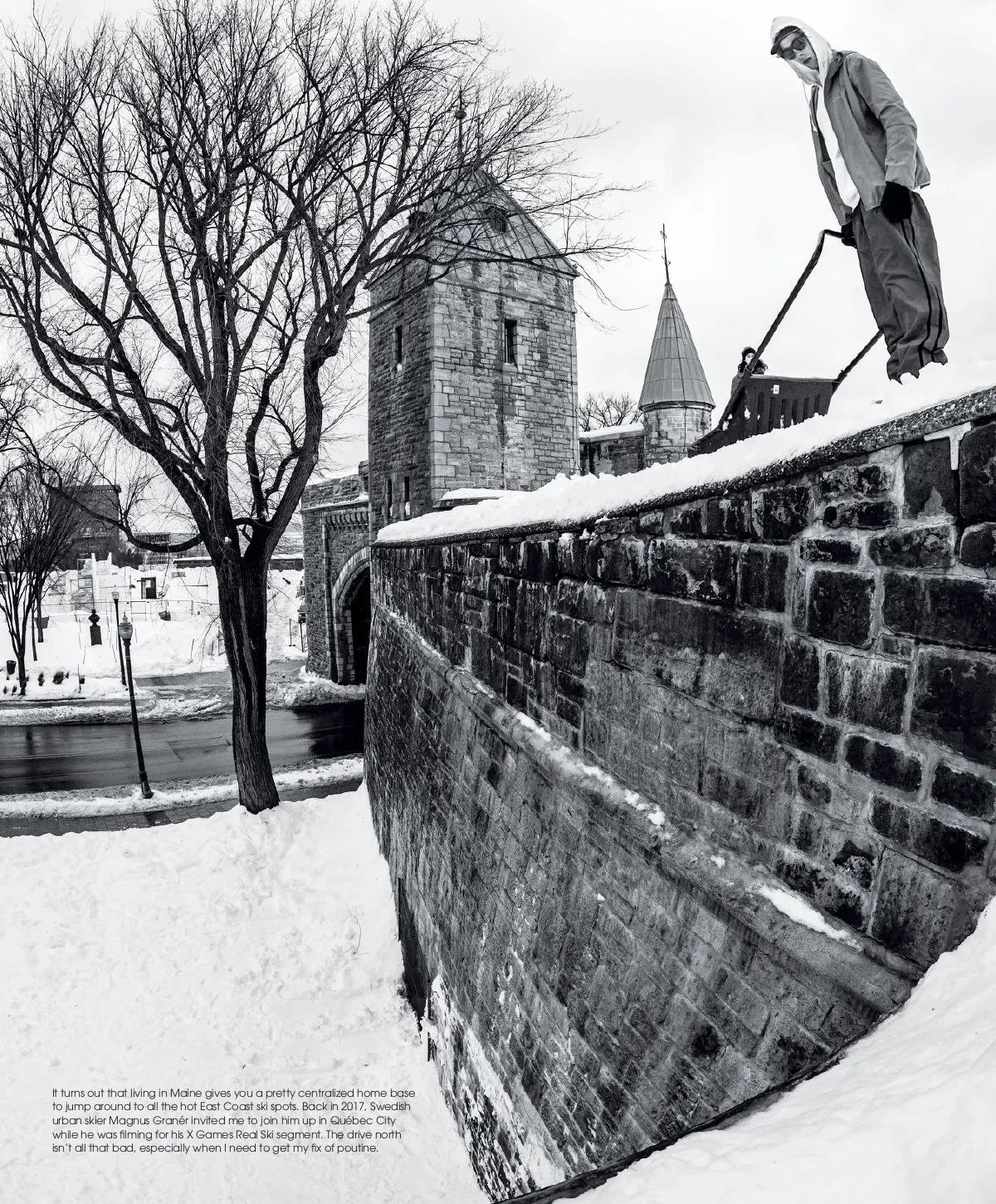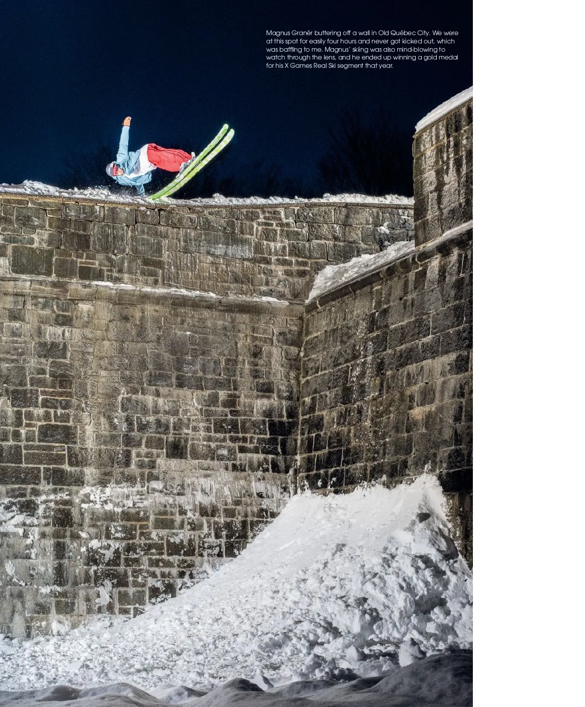 Magnus Granér buttering off a wall in Old Québec City. We were at this spot for easily four hours and never got kicked out, which was baffling to me. Magnus’ skiing was also mind-blowing to watch through the lens, and he ended up winning a gold medal for his X Games Real Ski segment that year.