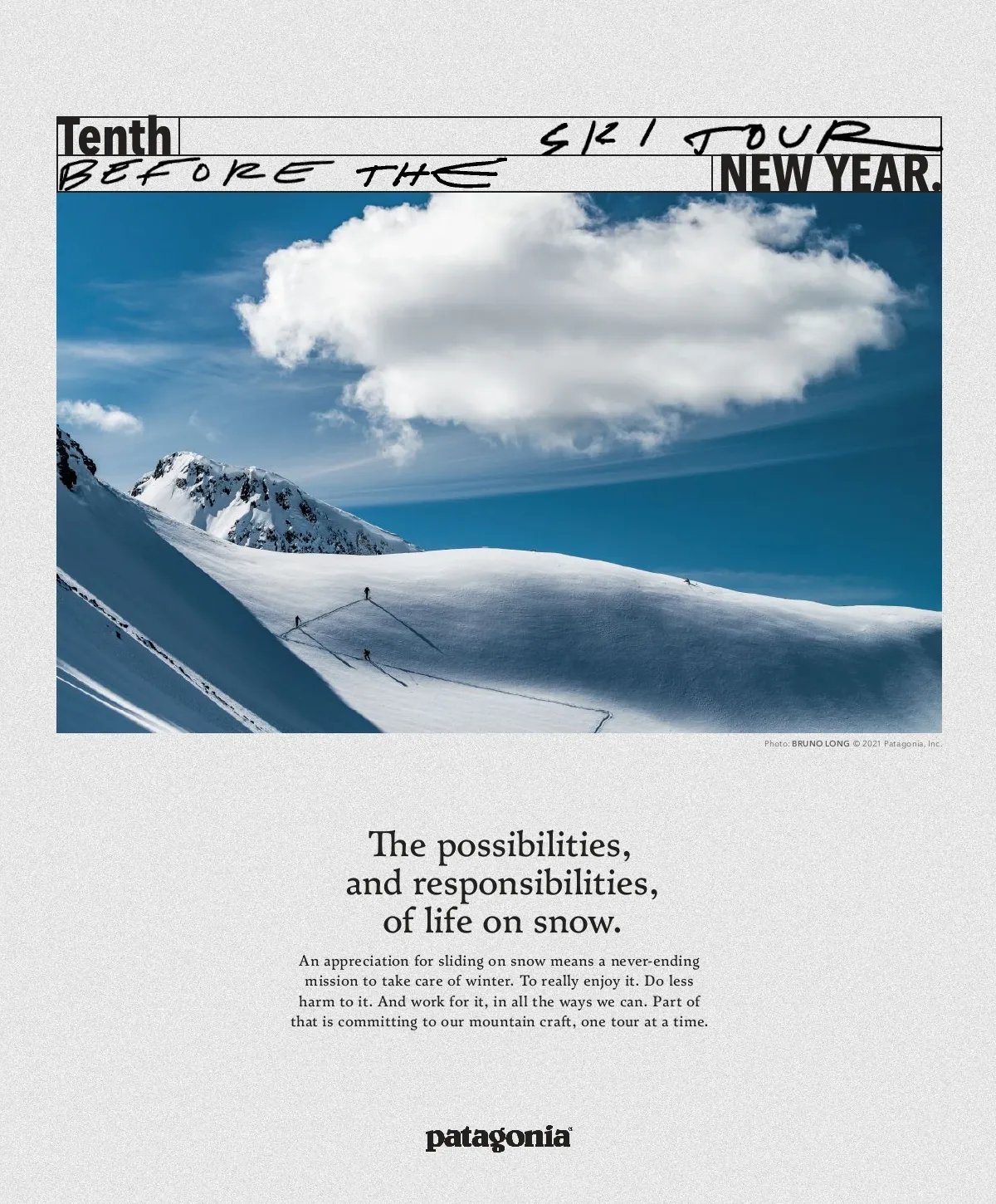 Tenth NEW YEAR. Photo: BRUNO LONG © 2021 Patagonia, Inc. The possibilities, and responsibilities, of life on snow. An appreciation for sliding on snow means a never-ending mission to take care of winter. To really enjoy it. Do less harm to it. And work for it, in all the ways we can. Part of that is committing to our mountain craft, one tour at a time.